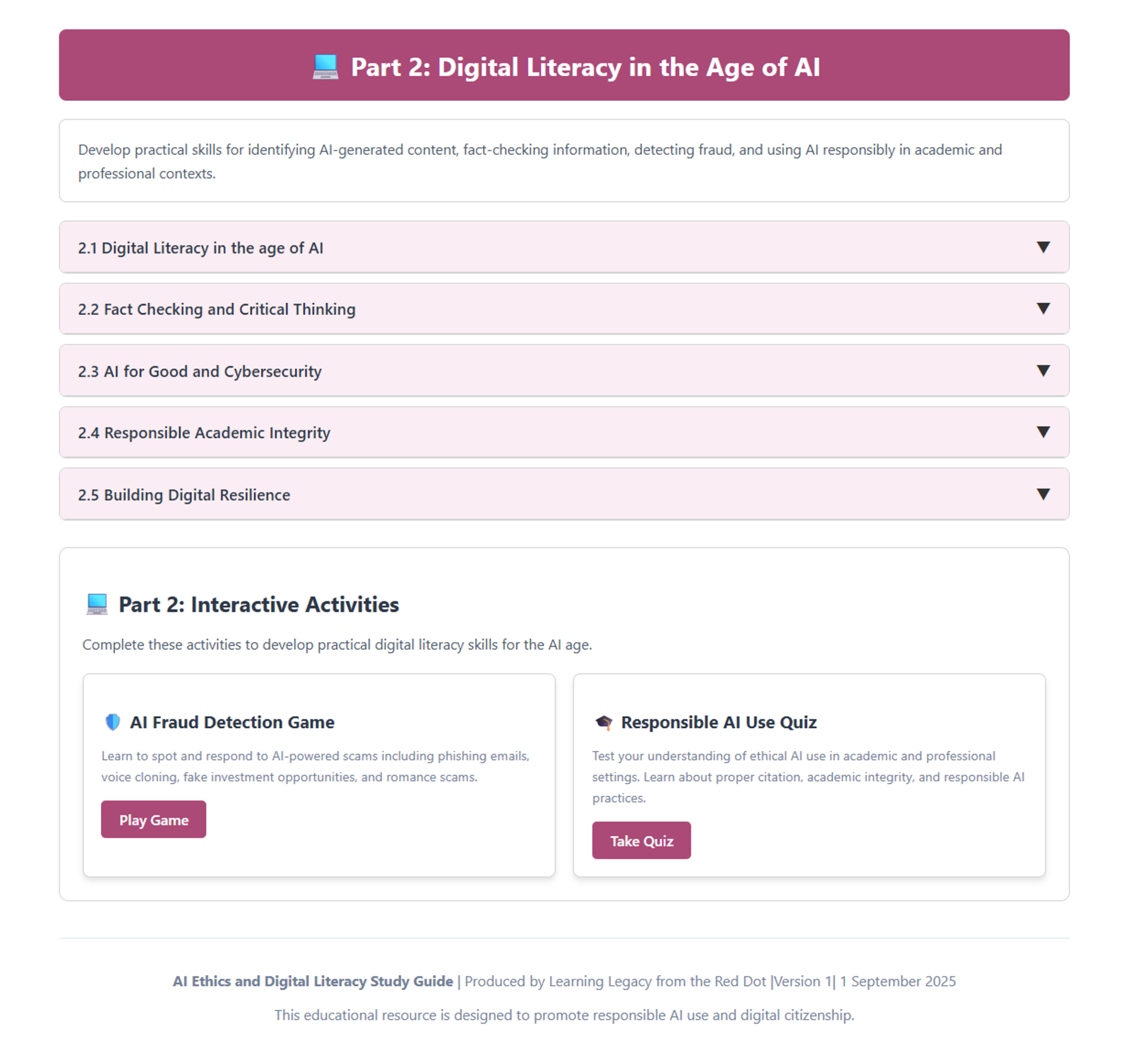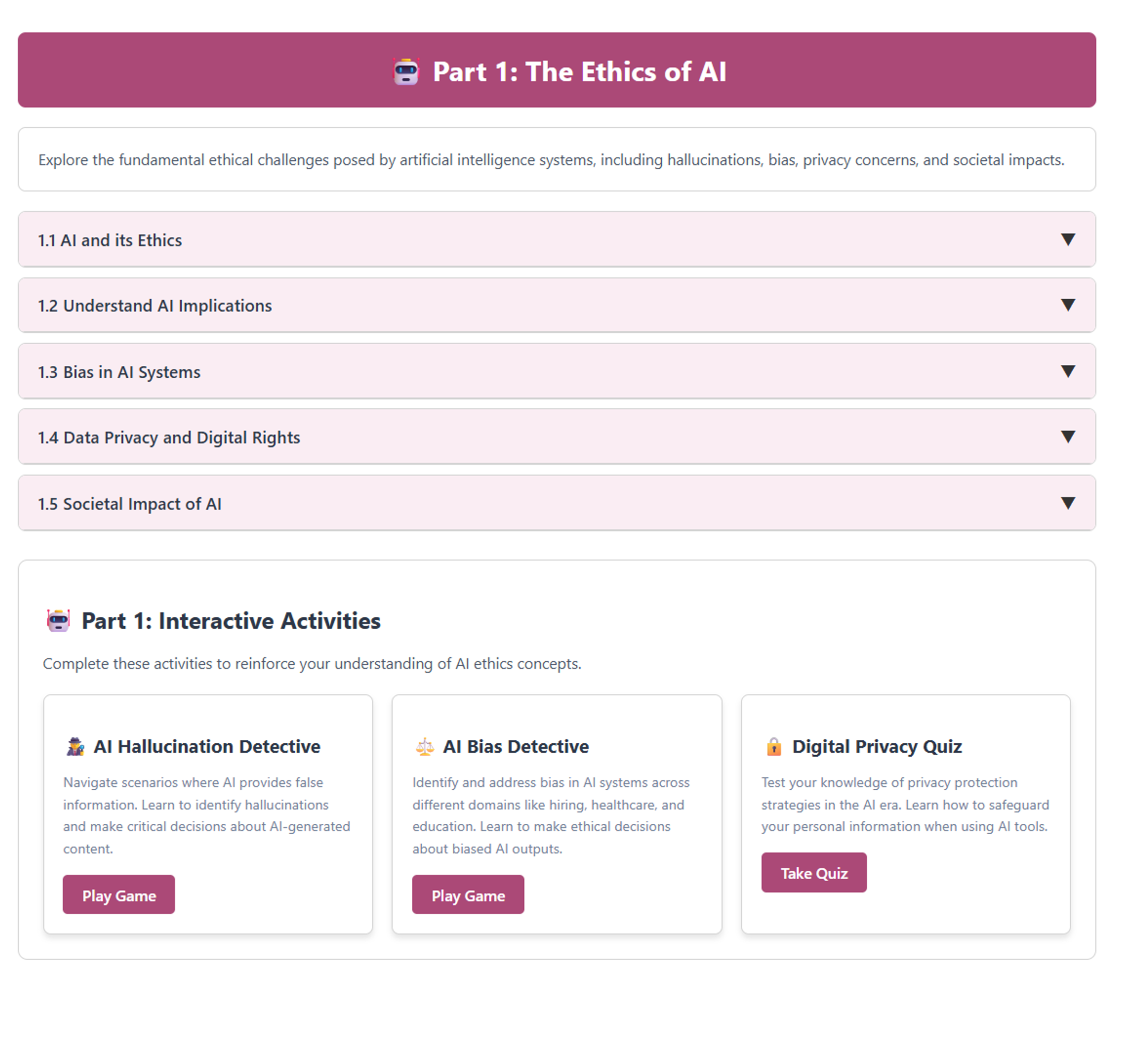 ✔️ Master Essential AI Literacy Skills Go beyond theory with scenario-based learning, interactive games (like the AI Hallucination Detective), and quizzes. Instantly reinforce your ability to spot AI bias, detect deepfakes, and verify AI-generated content, ensuring you only use reliable information.